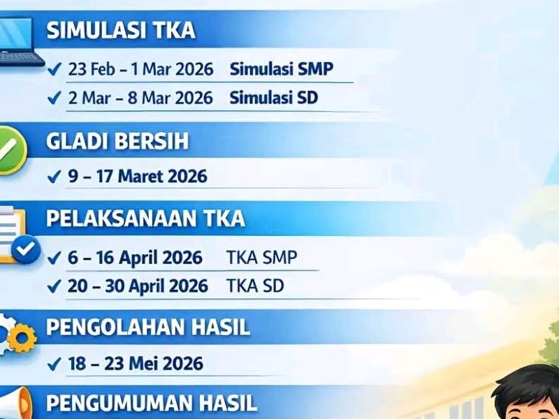 Pada Senin 2 Februari 2026, Telah Rilis Persiapan TKA Bagi Kelas 6, Tes Kemampuan Akademik (TKA) untuk kelas 6 SD/MI tahun 2026 adalah ujian opsional yang dirancang untuk mengukur kompetensi literasi dan numerasi. Berdasarkan jadwal, ujian dilaksanakan pada 20-30 April 2026, dengan materi utama mencakup soal matematika berbasis pecahan, perbandingan, dan operasi hitung campuran, serta pemahaman bacaan Bahasa Indonesia.